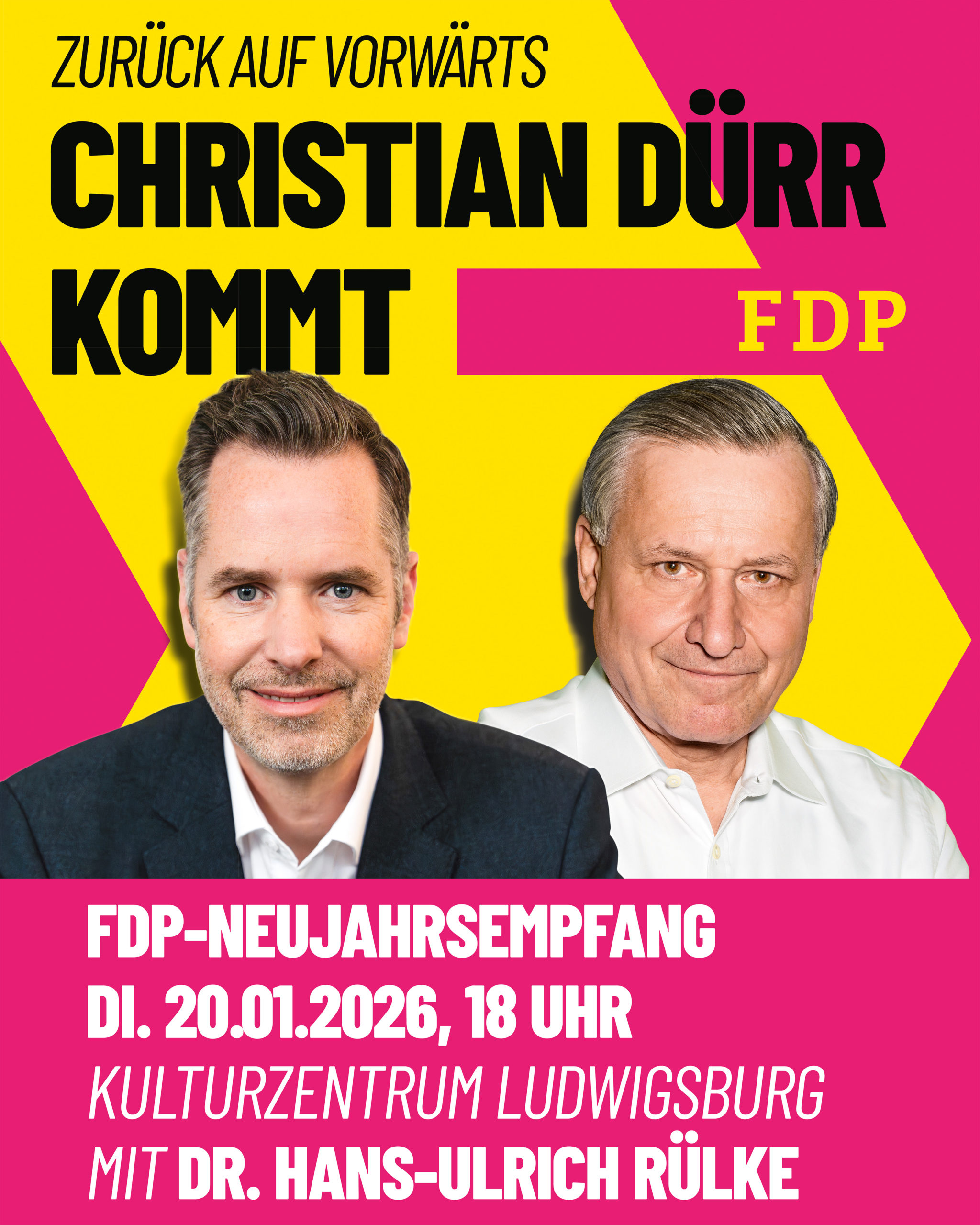 Um eine Anmeldung unter https://fdp-lb.freie-demokraten.de/termin/neujahrsempfang-mit-christian-duerr-und-dr-hans-ulrich-ruelke wird gebeten.